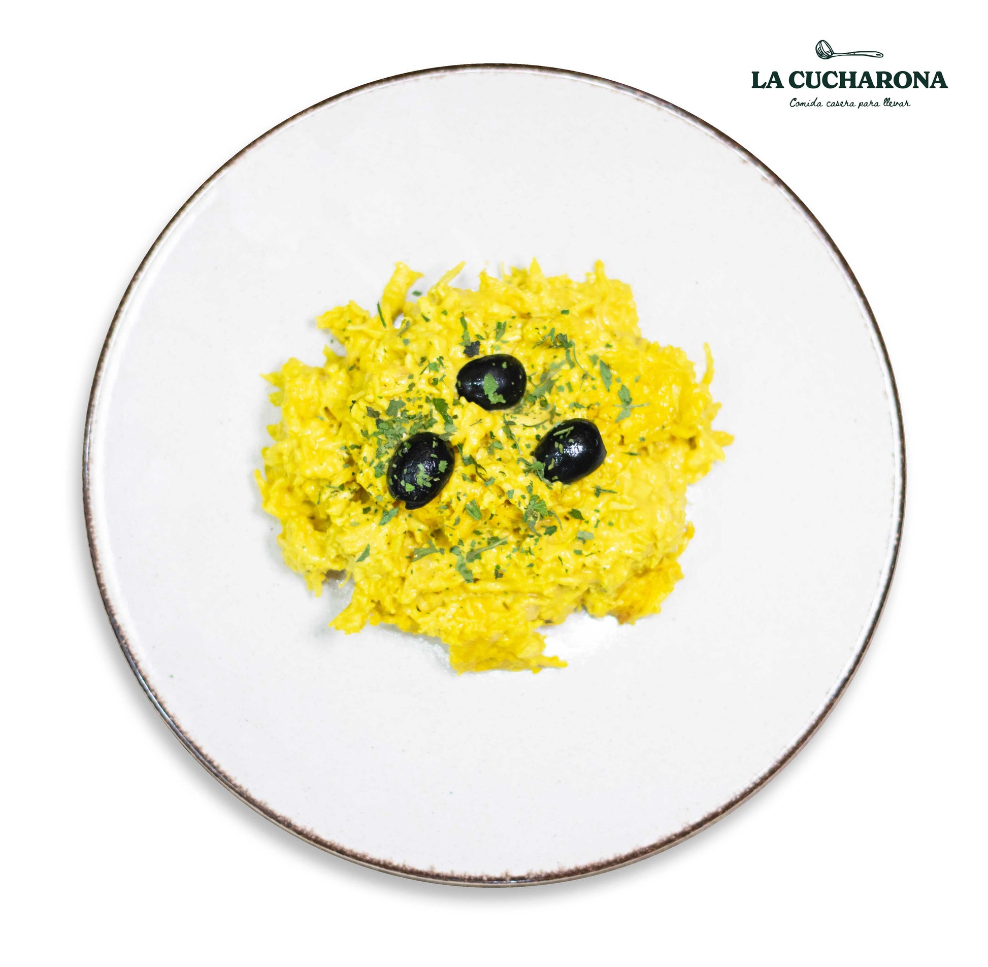Ingredientes: carne de pollo, ají amarillo, leche evaporada, pan de molde, cebolla, queso, cúrcuma, sal, AOVE y aceitunas negras.