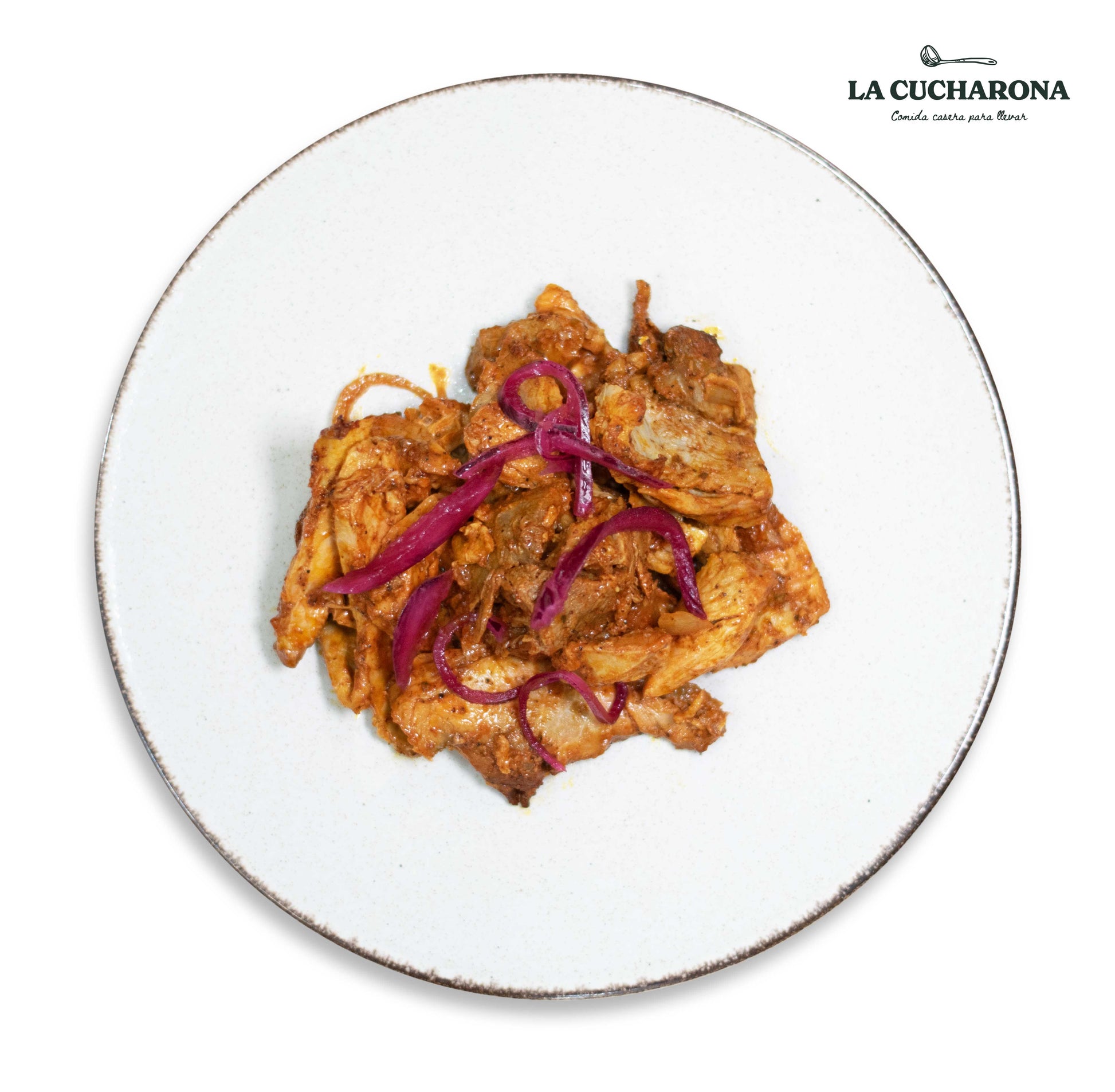 Ingredientes: Carne de cerdo, naranja agria, ajo, perejil, pasta de achiote, orégano, sal AOVE y pimienta. Cebolla morada rehogada.