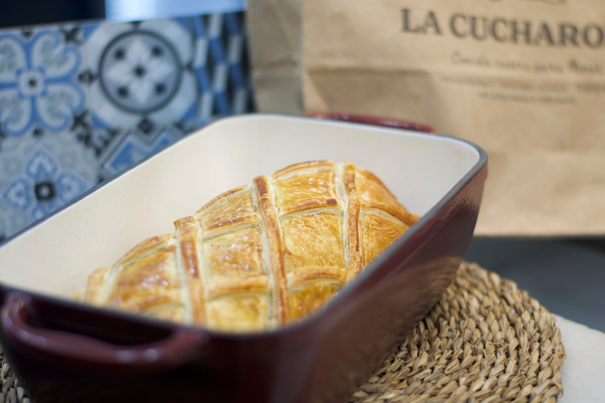 Hojaldre, farsa de champiñón, cebolla, mostaza, jamón serrano y nata.