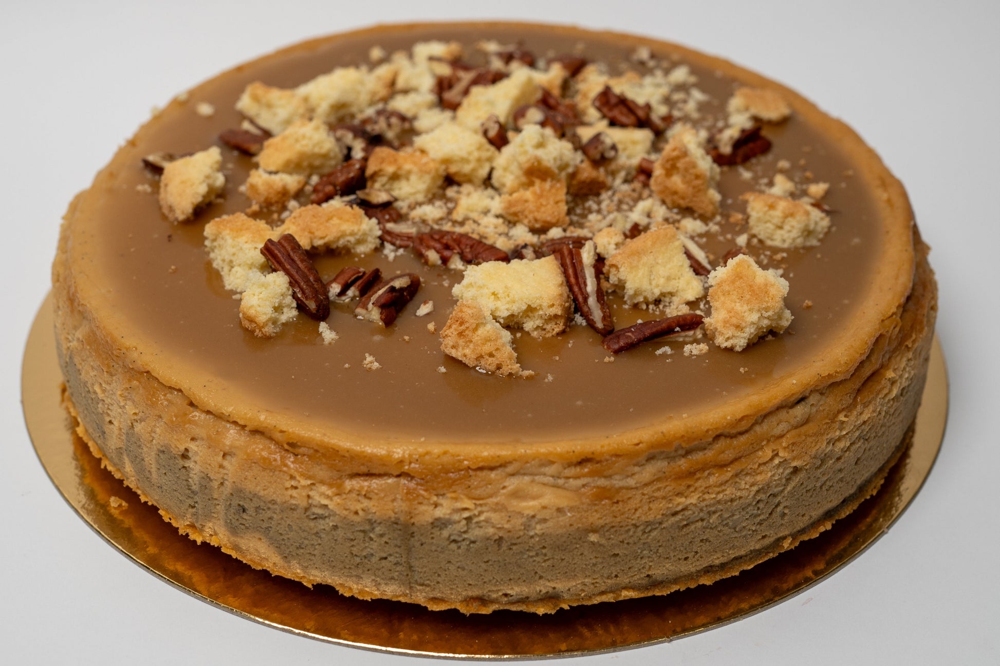 Base de galleta shortbread cubierto de una mezcla de queso suave y caramelo salado con topping de nueces de pecan.
